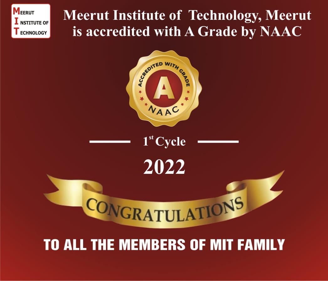 MIT is the First Technical Institution in Meerut to be Accredited by the National Assessment and Accreditation Council (NAAC) from 2022 with 'A' Grade. The High-Powered NAAC Peer Team Appreciated the Green Campus of MIT, Forays into R&D, Strong Srand Name and Academic Legacy as the Areas of Strength for MIT.